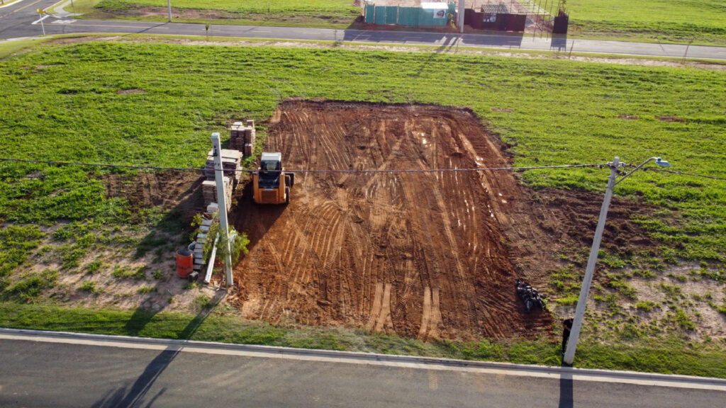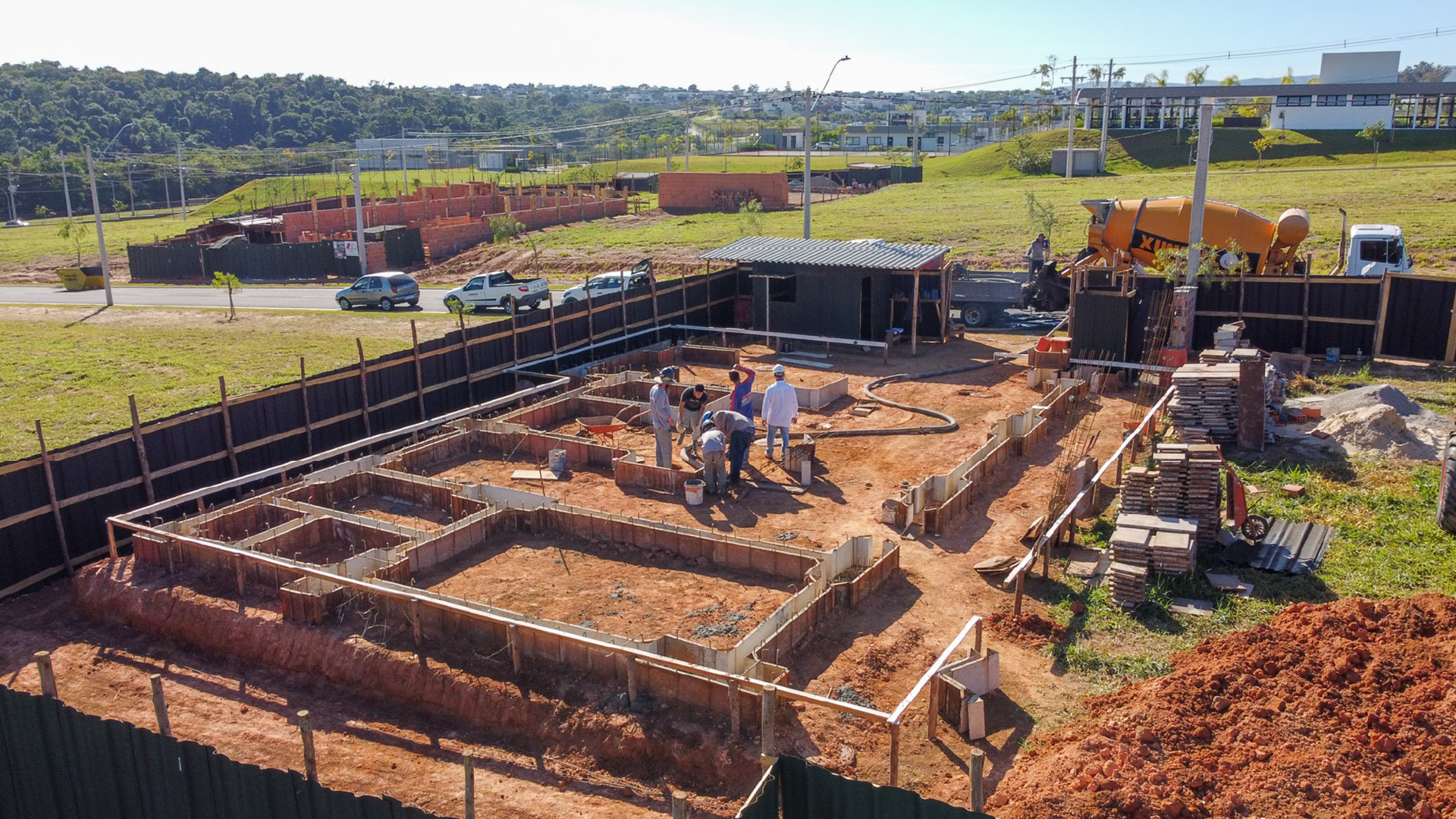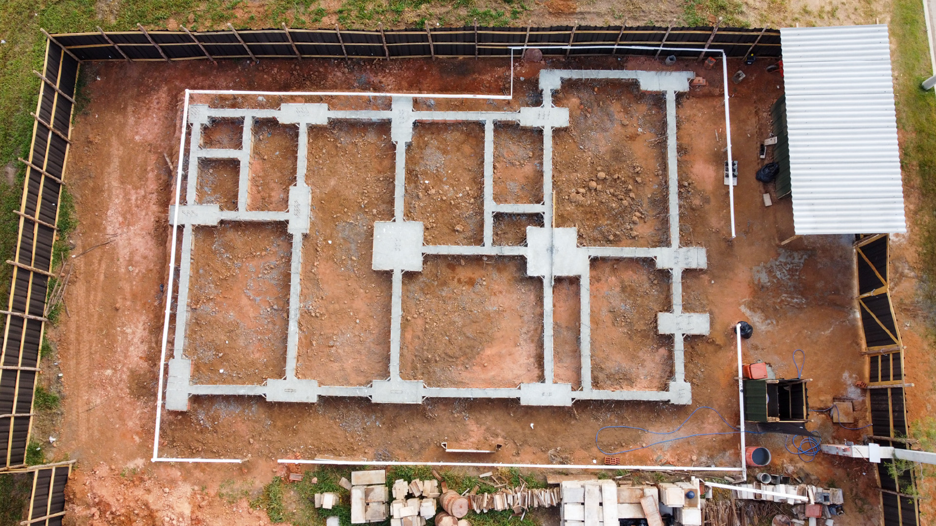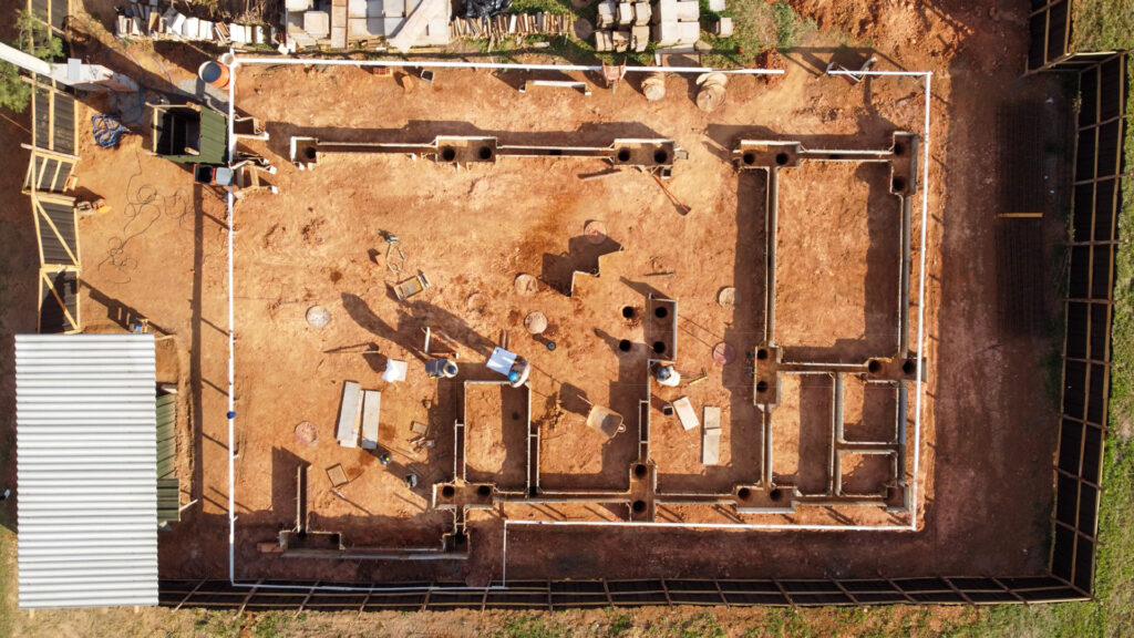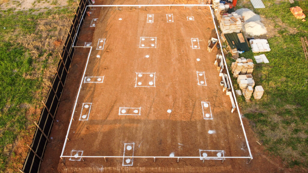A equipe executou topografia, montagem de gabarito, locação e perfuração de estacas, terraplanagem, perfuração, além de montagem de formas metálicas, concretagem das estacas, concretagem de vigas baldrame e blocos e colocação de ferragem armada de fundação.