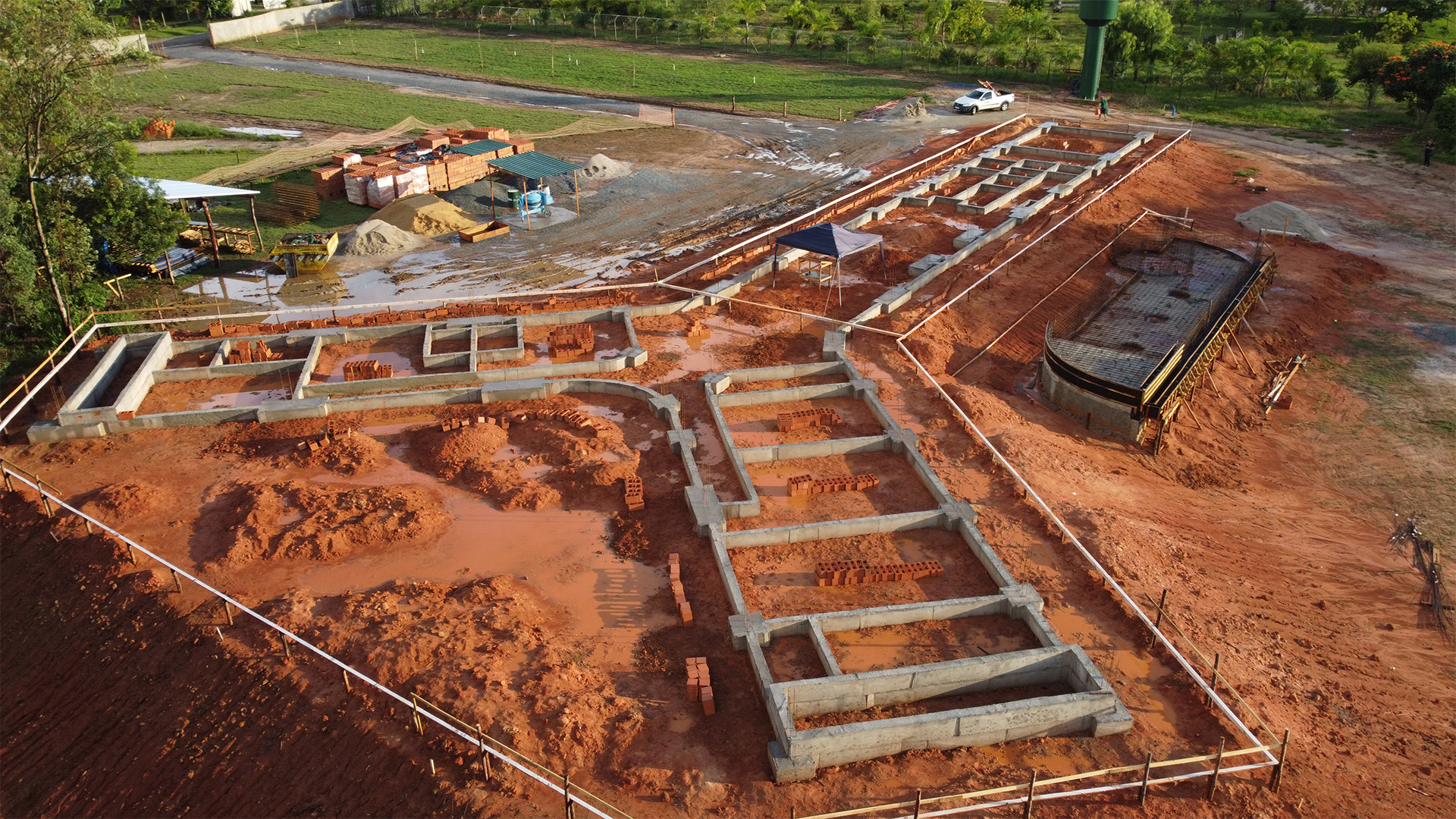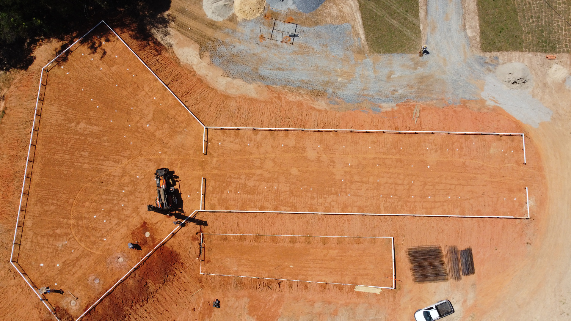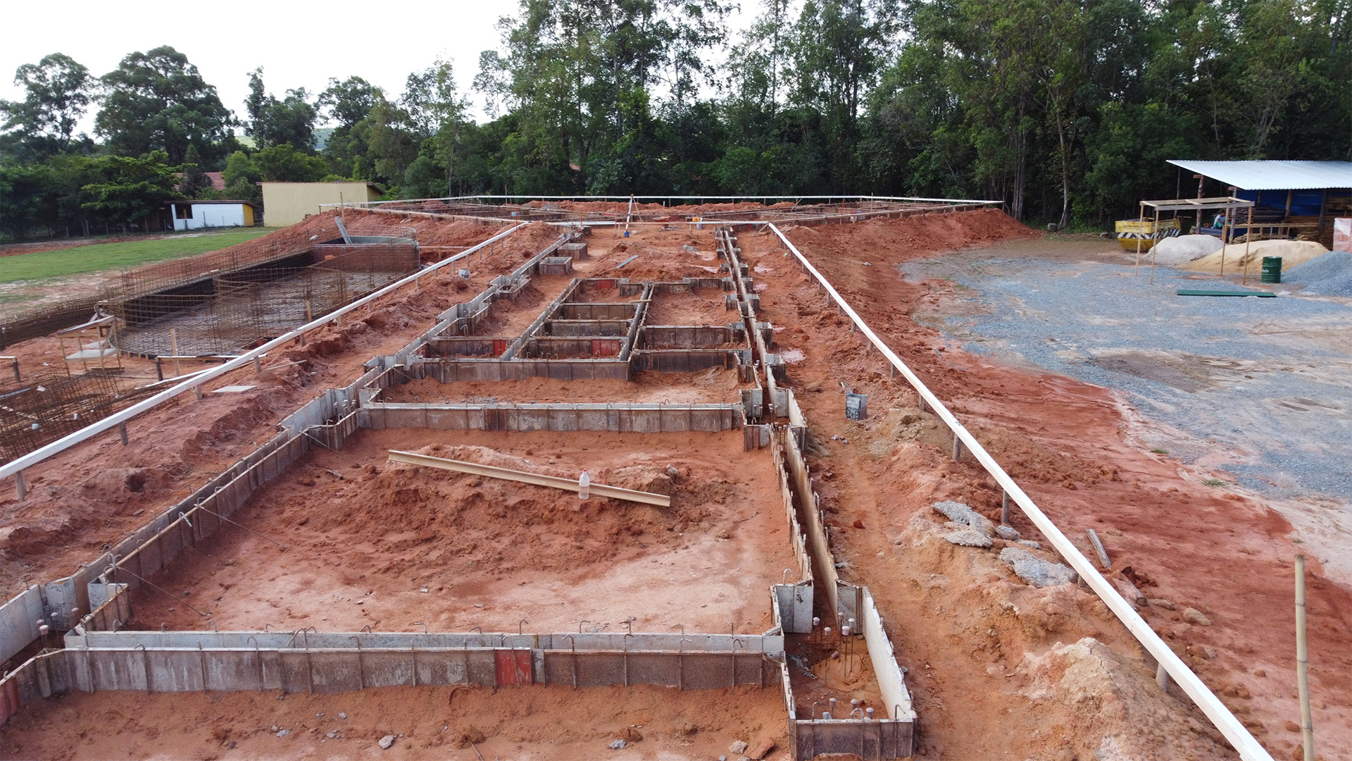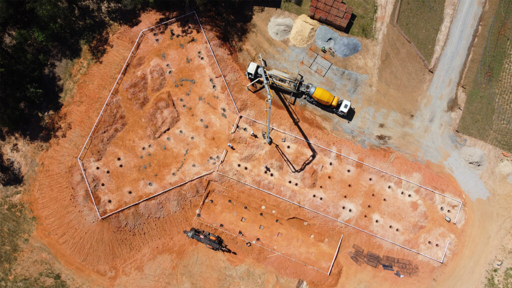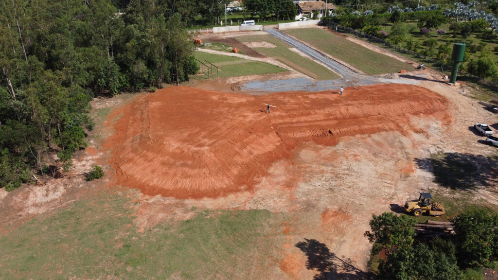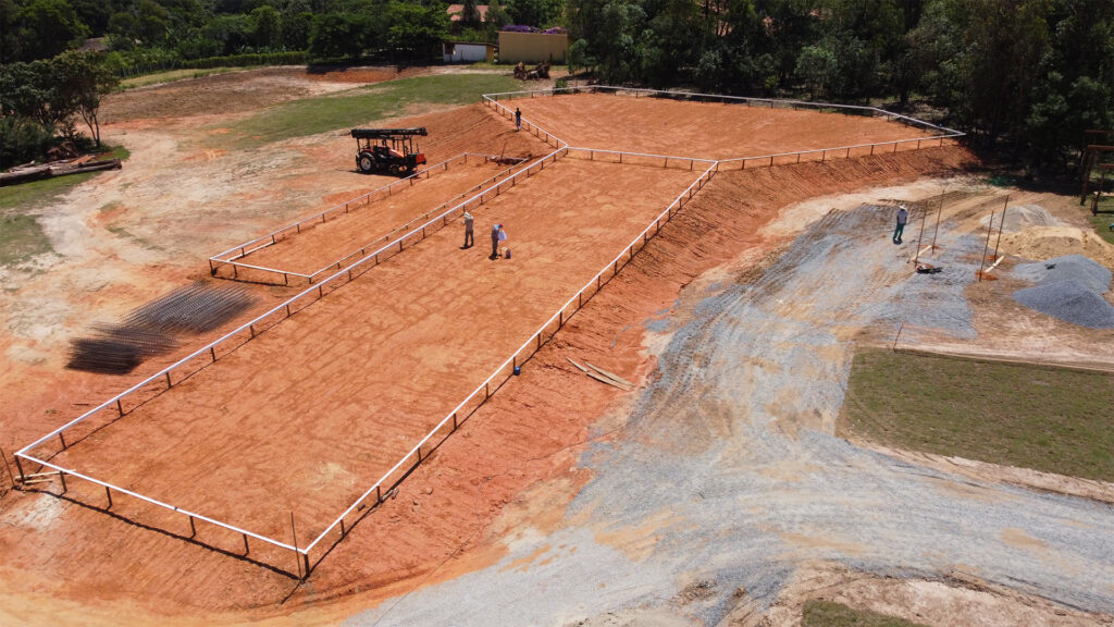 Iniciamos os trabalhos com a terraplanagem, enfrentando o desafio de elevar e estabilizar o platô. Após uma compactação rigorosa, avançamos para a montagem do gabarito, marcação, perfuração, instalação das formas metálicas e concretagem. Todo o processo foi conduzido com máxima segurança e controle, garantindo a execução completa e eficiente da fundação.