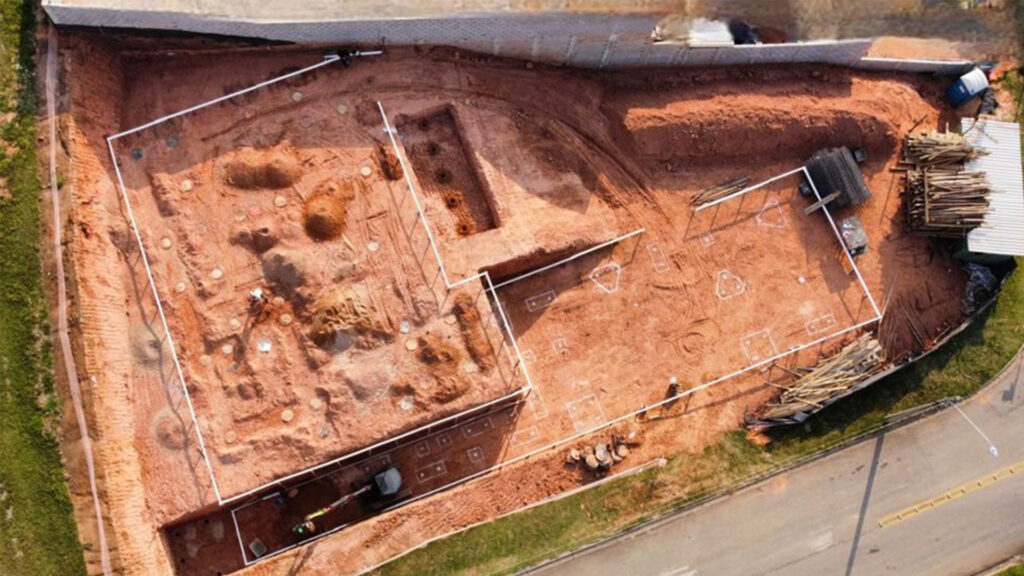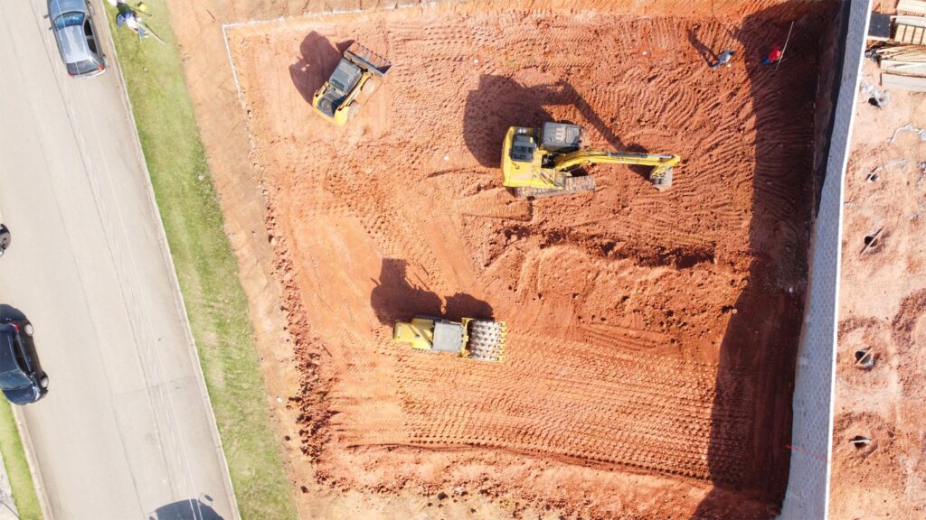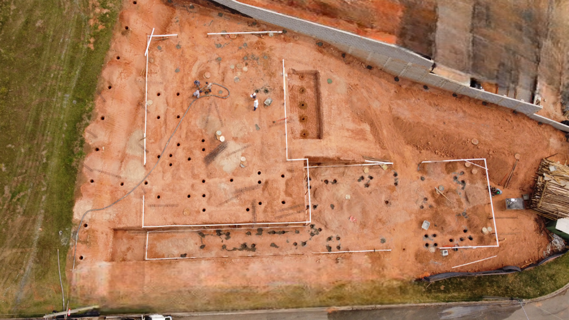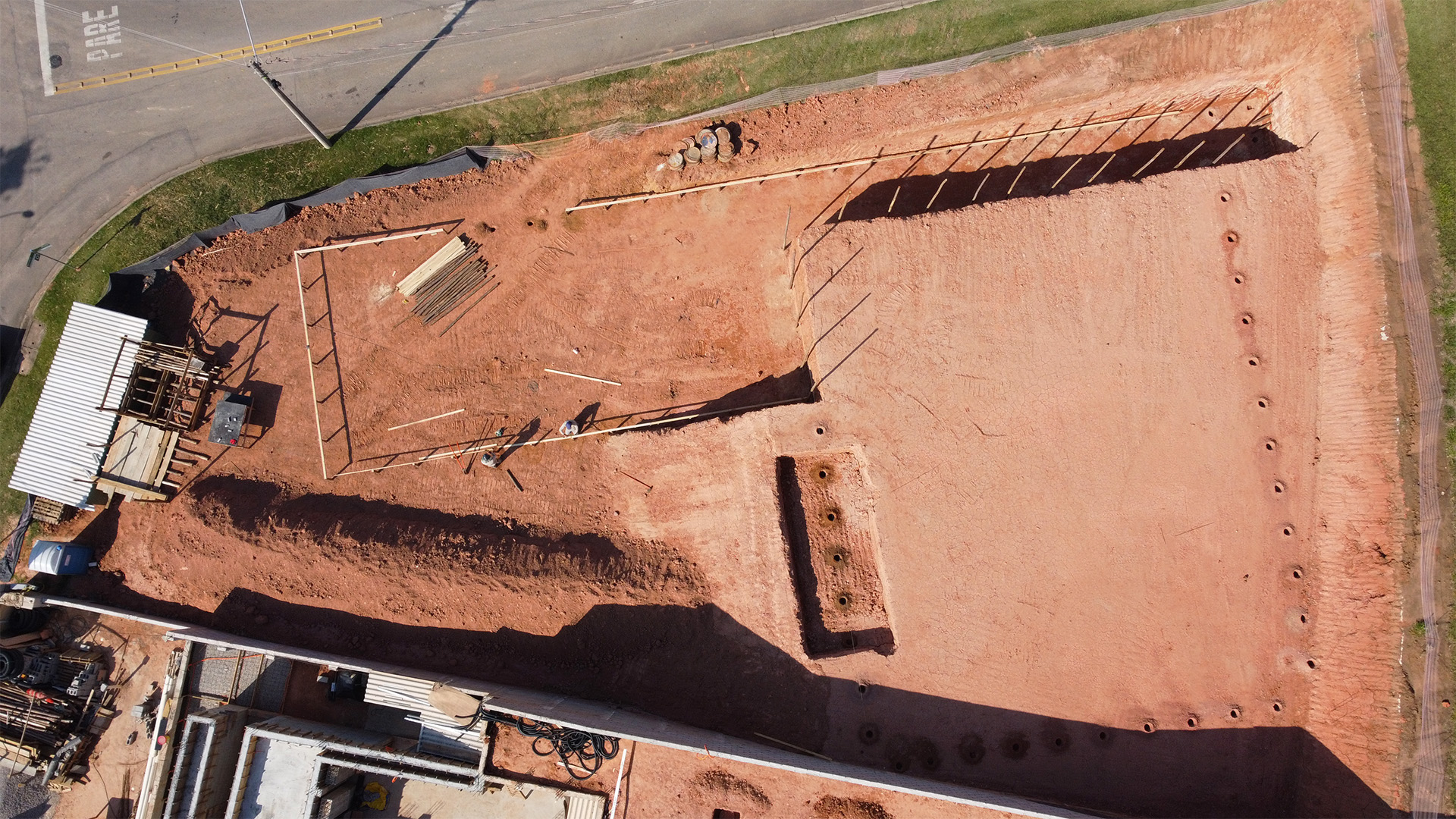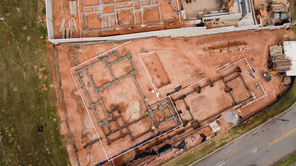 Na Casa MC, localizada no Condomínio Jequitibá, em Sorocaba, a fundação foi executada em dois níveis de platô, respeitando as características do terreno e as diretrizes do projeto. Os serviços tiveram início com a raspagem vegetal, seguida pelas etapas de corte, aterro e compactação do solo, assegurando a estabilidade necessária para a obra.