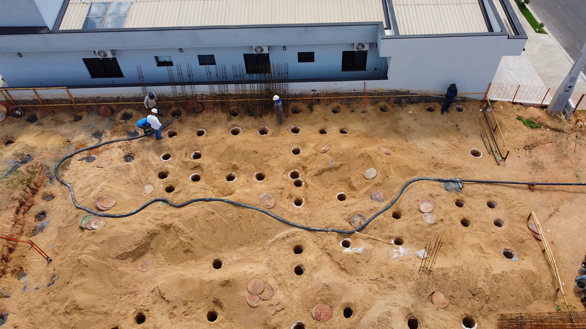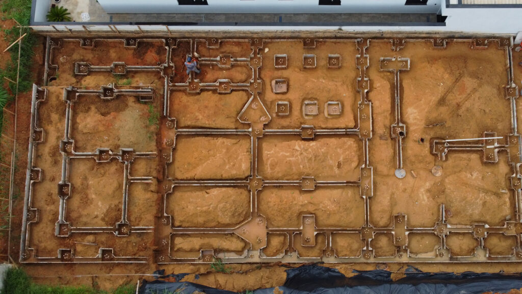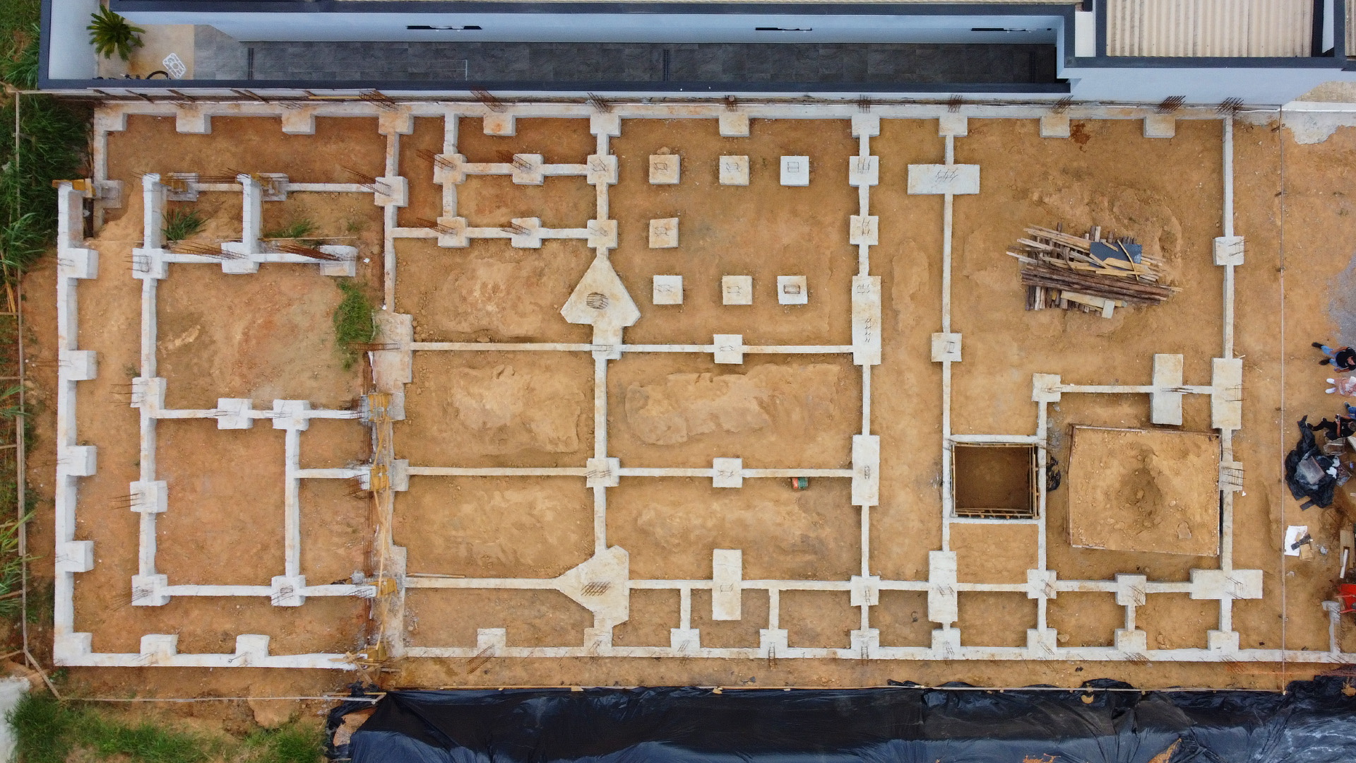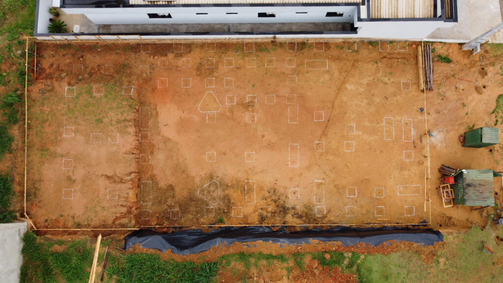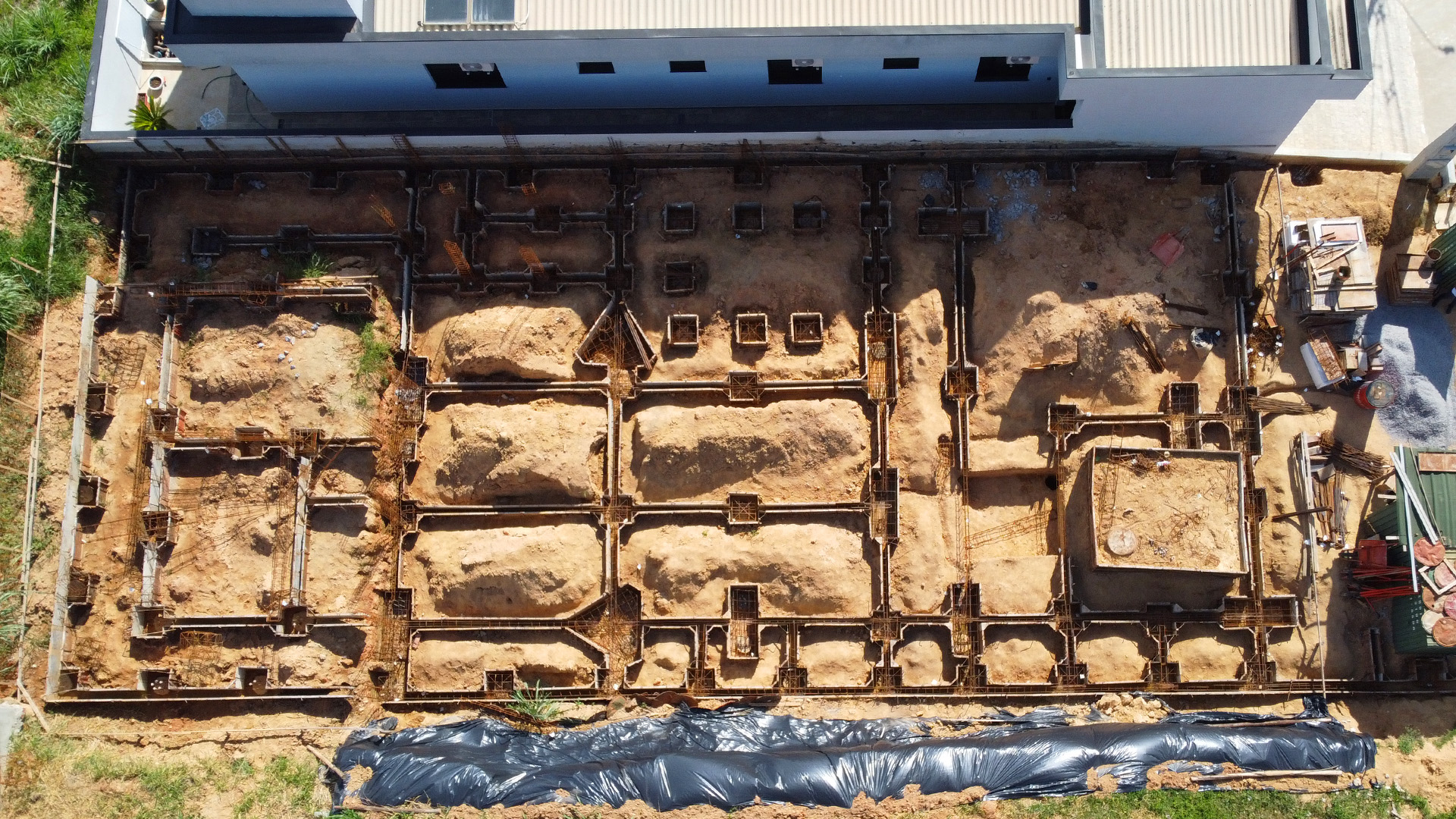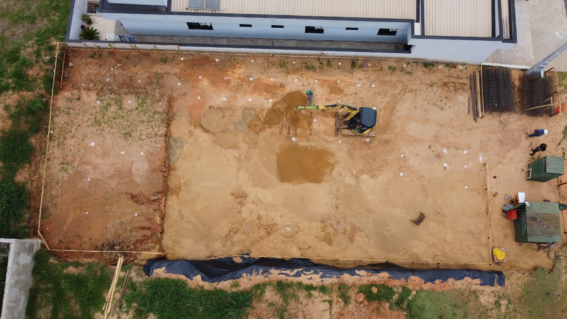 Na Casa EB, em Itu, iniciamos a obra com a raspagem vegetal e o corte do terreno até atingir os níveis ideais definidos em projeto. A partir daí, avançamos para a perfuração e concretagem das estacas, com acompanhamento técnico em todas as etapas para garantir segurança e qualidade.